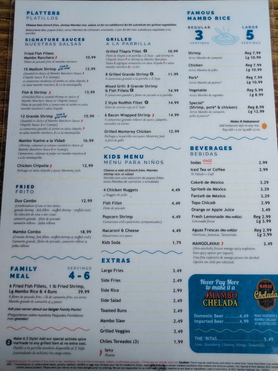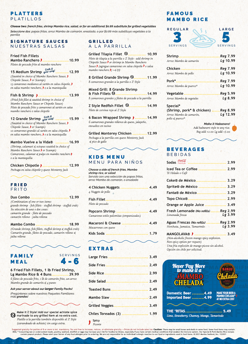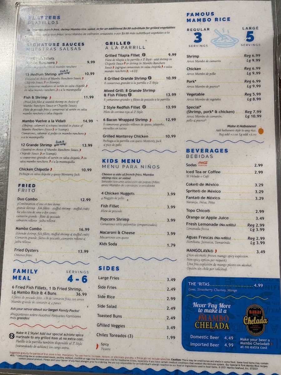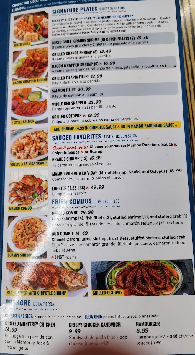 One standout feature is the tantalizing selection of sides, such as grilled mixed veggies and the signature Mambo Style Sauce, which elevates any dish with its rich, buttery flavor. For those craving a refreshing drink, the Mambo Chelada provides a unique twist, perfectly complementing the robust seafood offerings.